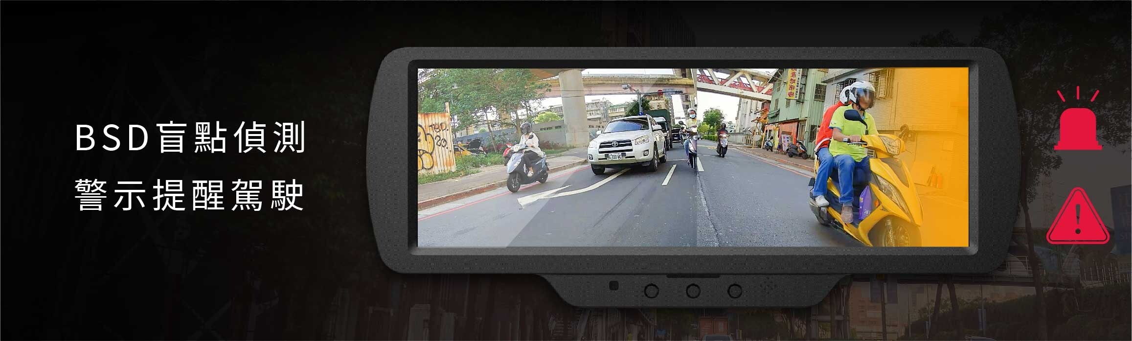 盲點偵測(BSD)|透過安裝在車體兩側的盲點感應器偵測兩側盲點區,當有車輛進入鏡盲點區時,將會透過電子後照鏡閃爍及響鈴提醒駕駛人,藉此減少發生碰撞機率。